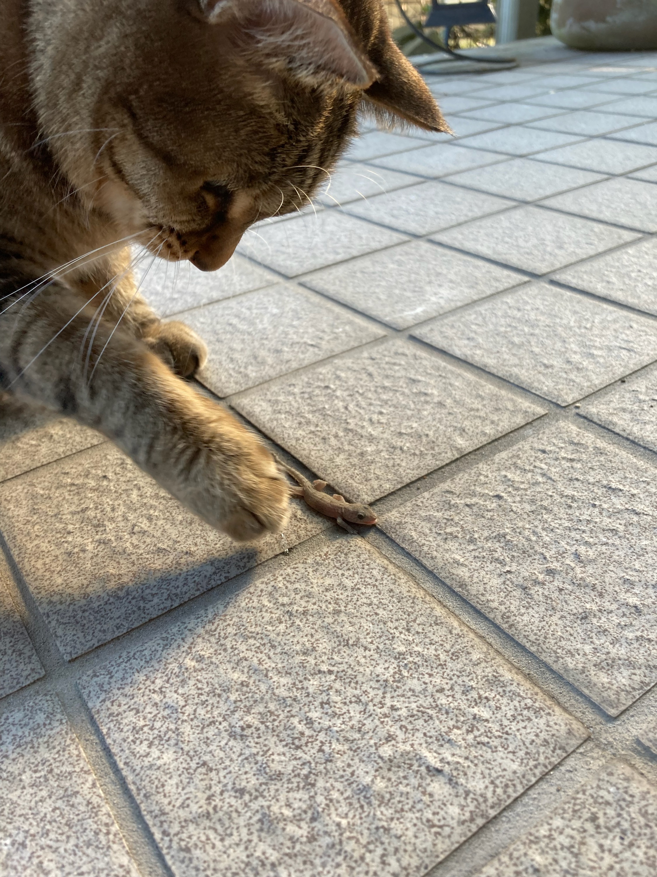 我が家の愛猫はお正月にバルコニーでヤモリと遊んでおりました。。