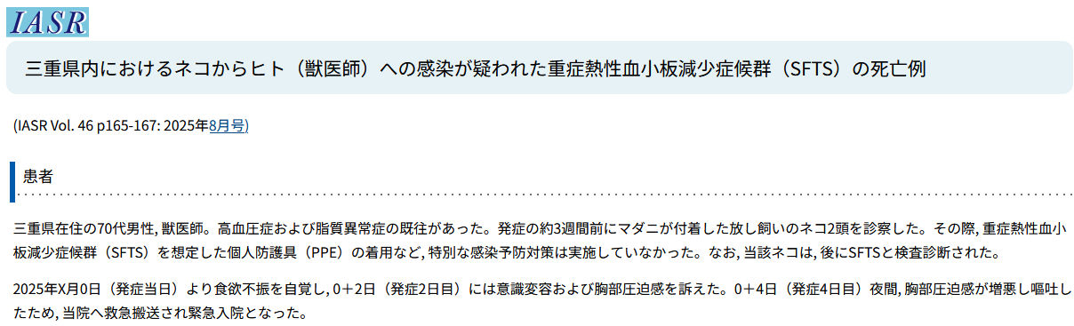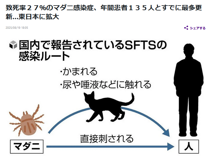 特に昨年は、マダニが媒介する重症熱性血小板減少症候群(SFTS)の猫さんを治療した獣医師が、その後ご自身もSFTSを発症し亡くなられたという痛ましいニュースがありました。記憶に残っている方も多いのではないでしょうか。